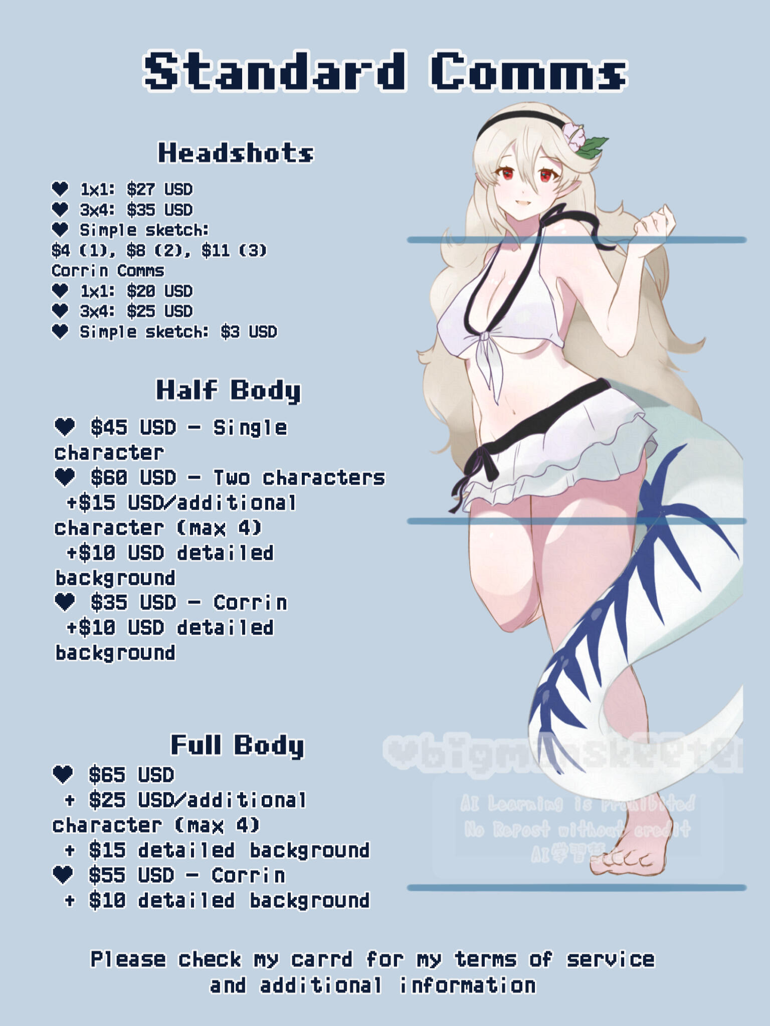 If you decide not to go through the commission past the sketch stage, then I will issue a refund. After that, any cancelations will only render a partial refund (50%). No refunds after the art is complete. No refunds for headshot sketches. If I decide to drop the project altogether, however, I will give a full refund.For payment plans, you will be required to make a $10 nonrefundable down payment and a $2 nonrefundable commitment fee. While you can cancel at any time, each payment installment that had already been made is nonrefundable.■ ■ ■ART USAGE POLICY● Under no circumstances will I approve AI training off my art. Ever.